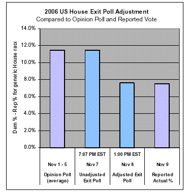There is a significant over-sampling of Republican voters in the adjusted 2006 Exit Poll. It simply does not reflect the actual turnout on Election Day 2006.